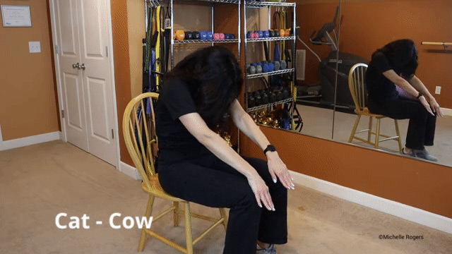 Sit up tall, positioned toward the front of the chair, with your palms resting on your legs and feet flat on the floor. Inhale and look up, as you arch your back. Exhale and round your back and tuck your chin, as your hands slide forward along your legs. Repeat.