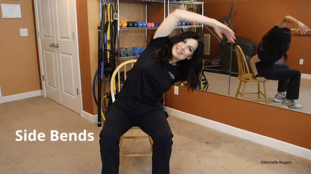Sit up straight, positioned toward the front of the chair, with your hands behind head, and feet hip width apart. Lean as far left as you can go, return to center, then lean to the right. Focus on bending at the waist and going directly to the side without leaning forward.