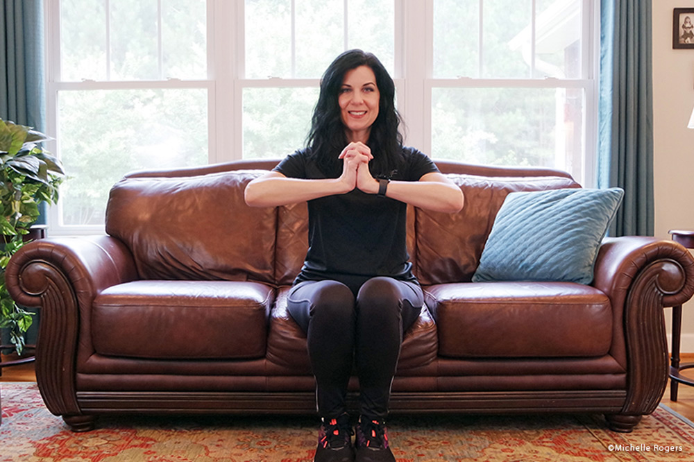 Position yourself with your hands shoulder width apart on the edge of the sofa, with straight arms, knees bent at a 90-degree angle, and feet flat on the floor.