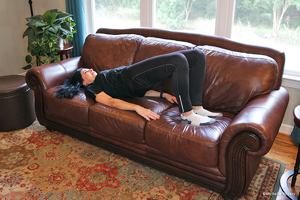 Lie on your back on the sofa or floor, with feet flat about hip width apart. Tighten your buttocks and push them up off of the sofa. Keep your hips lifted with your body in a straight line from your knees to your shoulders. Hold. Then raise and lower in smaller “pulses,” squeezing tight each time you push up.