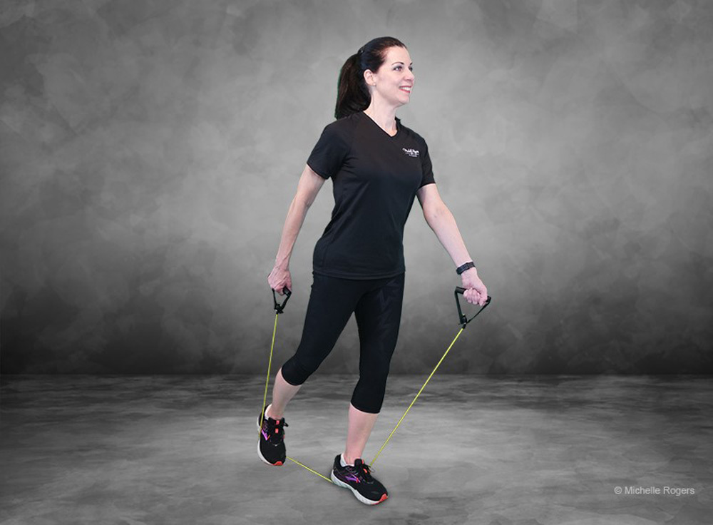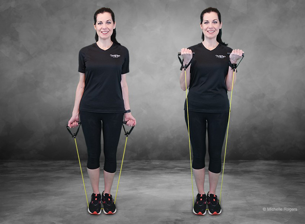 Here’s the resistance band version of the classic arm strengthening exercise. Begin with feet together, band securely underneath your feet, palms facing out. Bend arms, bringing your hands toward shoulder height, then lower back down.