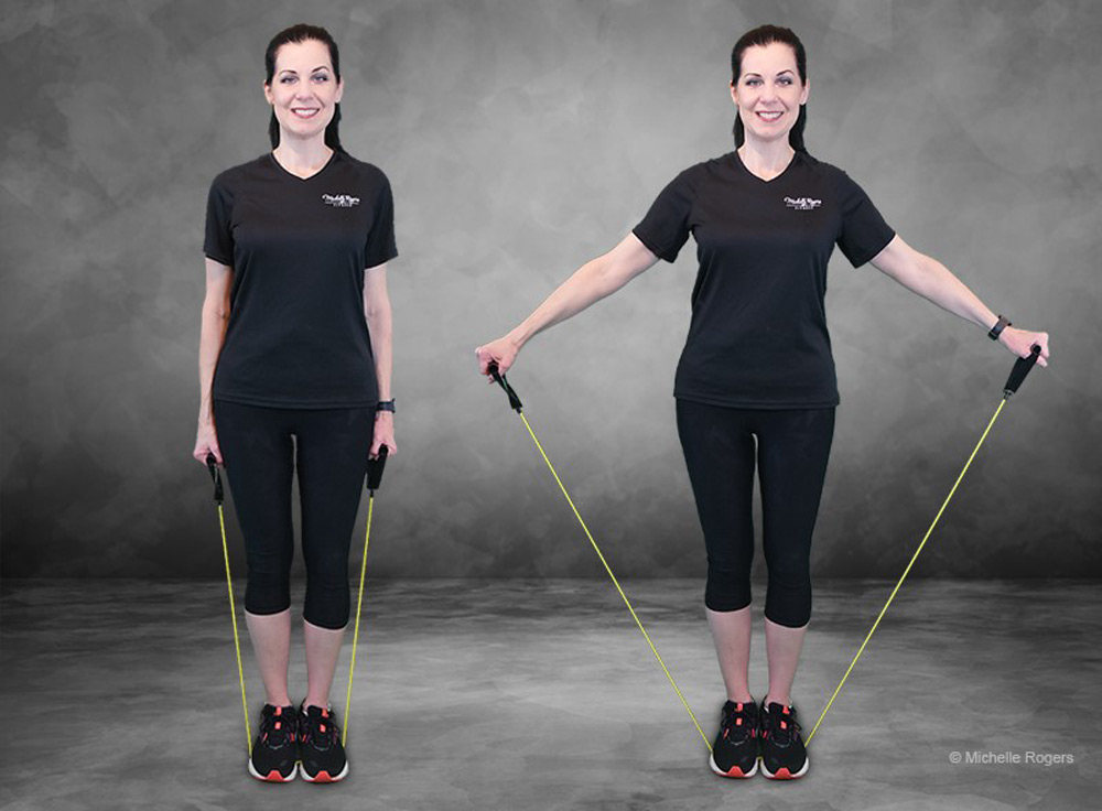 This exercise really works your shoulders and upper back. Stand on the exercise band, feet together, with palms facing in. Raise arms out to the side, either together or alternating one arm at a time. Keep your wrists straight and not bent down, and straight arms.