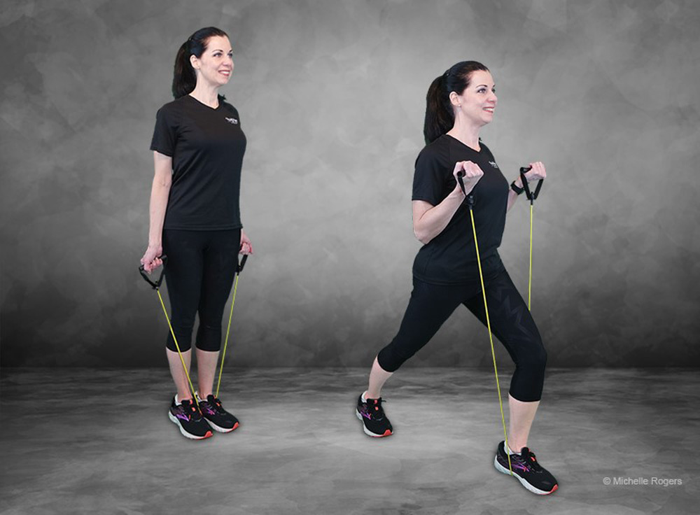 Begin with the band underneath your left foot, and your palms facing forward. Lunge forward with your left leg, striking with your heel first, while you bend arms into a bicep curl. Push up with foot to return to a standing position. Complete reps, and then do the right side.