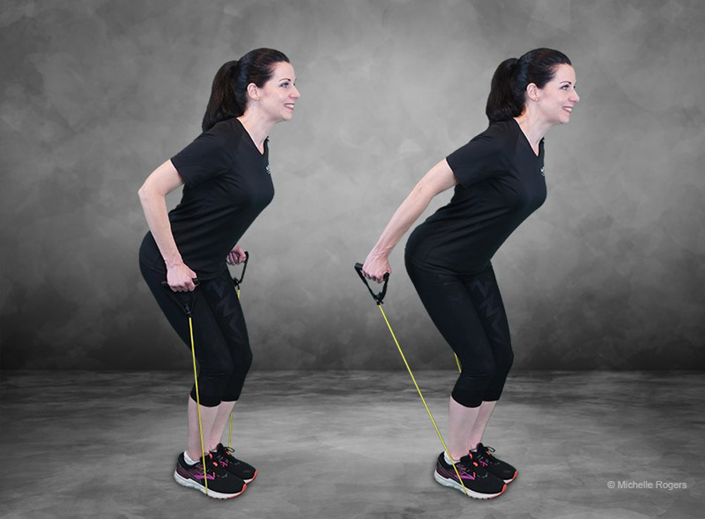 This exercise tones the back of your upper arms. Hinge forward from your hips, keeping your back straight and not hunched over. Stand on the band, feet together. Bend your arms and straighten them to the back, lifting as high as you can. Imagine your shoulder blades coming together. Return to starting position and repeat.