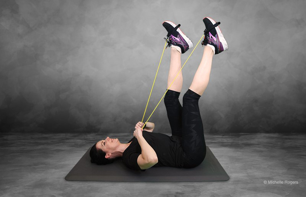 Put each foot in a handle. Lie on your back with legs lifted and toes pointed toward the ceiling, and hold the band with both of your hands. Draw your belly button into your spine. Scissor your legs up and down, moving slowly and keeping toes pointed.