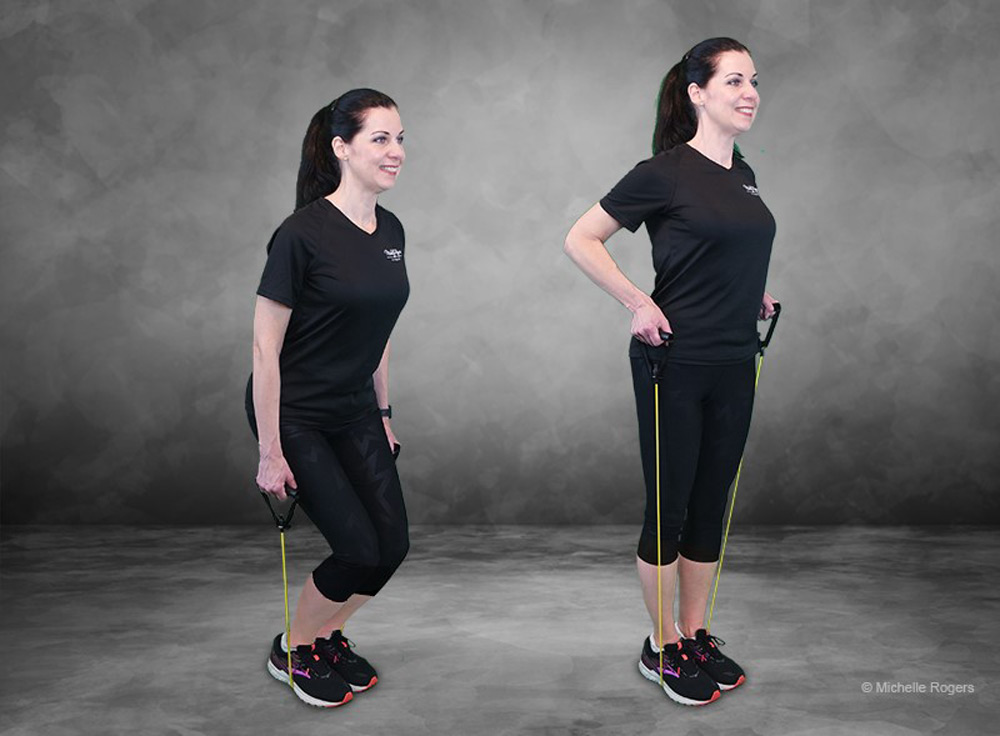 Begin with the band under feet, palms facing in. Squat, then stand as you lift up on the handles (as if you are lifting up two suitcases), keeping elbows to the back. Return to squat, repeat.