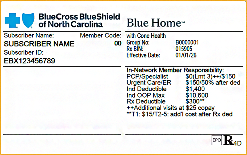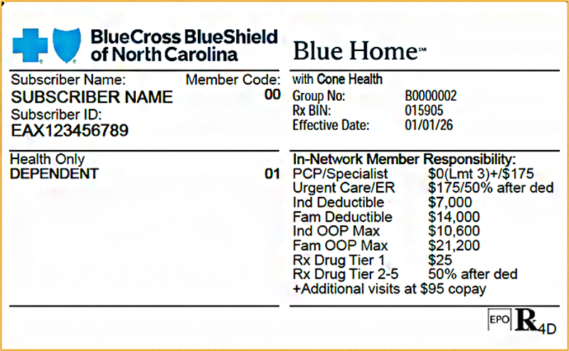 A Blue Home with Cone Health member can easily be identified by their member ID card. The Blue Home name will be prominently displayed on the front of the member ID card, along with the EPO logo in the suitcase. Blue Home with Cone Health product / plans will be offered to IU65 members in Guilford, Randolph, and Rockingham counties.